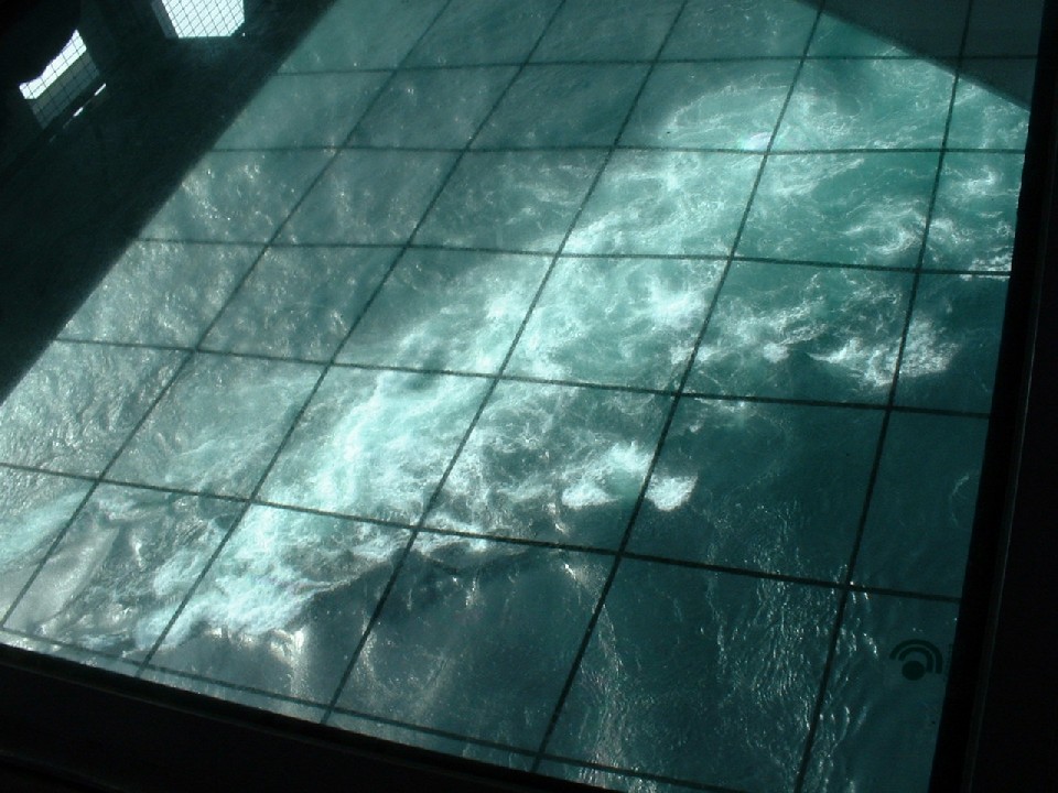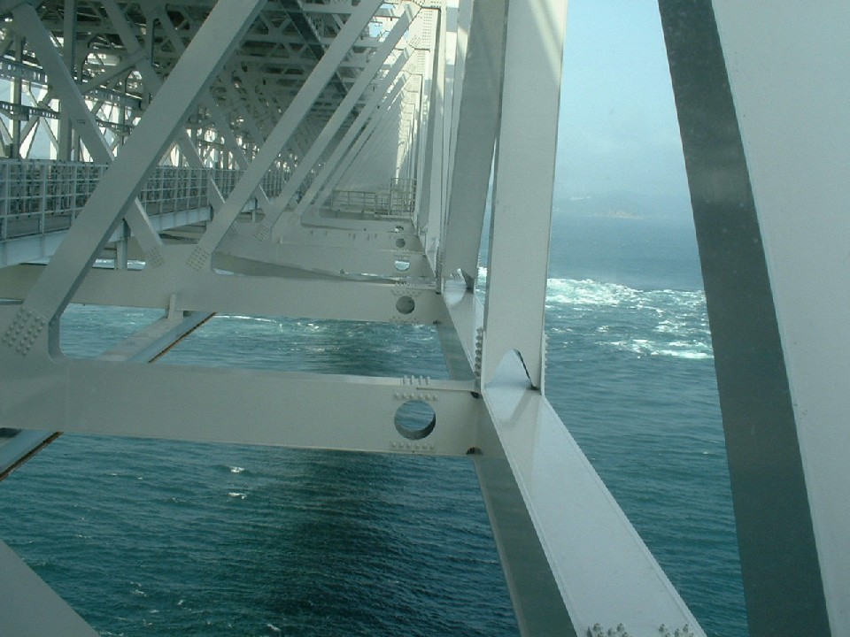 橋は、金網にしてあるので、すごい風である。橋の右の方に渦の一部が見える。こんな所に、よく橋を造ったものだ。見学者としては嬉しいが。(^^