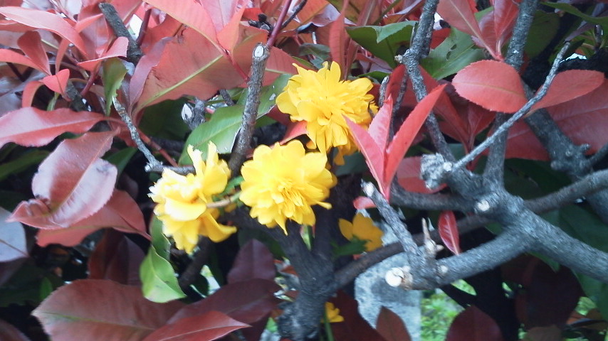 赤い葉はアカメモチで、黄色い花は八重山吹ではないかな?
