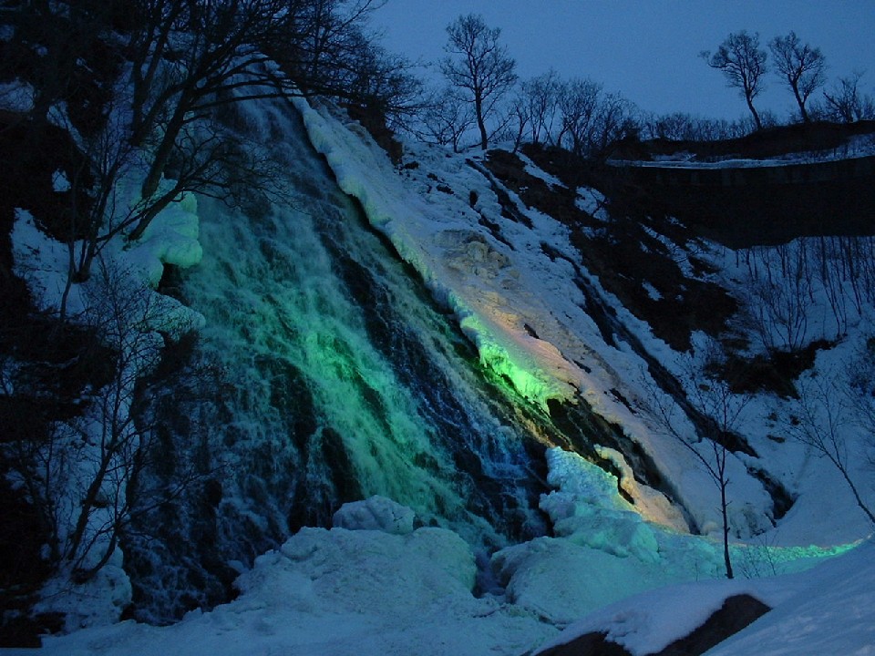 ライトアップされている所の、滝が凍っています。近づいていって、滝が完全に凍っているのを見ました。
