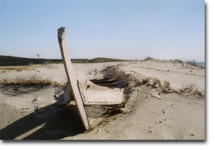 遠州灘の砂丘、昭和60年、或いはそれより一・二年前だったと思います。この舟、砂丘に埋もれていました。この時期でもよく形が残っていたと思います。或いは砂に埋もれていたのが、私が行ったとき、偶然うまく上の砂が飛ばされたのでしょうか。広い砂原にオブジェのように突き出していました。