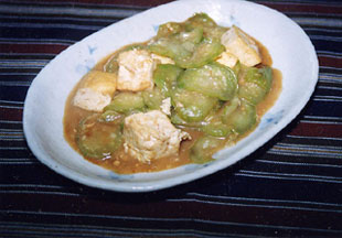 さて、きょうの料理はこれ。ナーベーラー、つまり、「へちま」ですね。ウブシーというのは「蒸し煮」です。へちまも食べ時というのがあって、見かけは同じでも成長しすぎるとトウがたって食べられません。あの垢すりの素ですね。だから若いものを使います。へちまは、ゆがいてさっぱりポン酢でもいいし、味噌汁の具にしても美味しい。茄子の料理感覚と似ています。では、ナーベーラー・ウブシーの作り方。用意するのは、若いへちま、豆腐(島豆腐がなかったら焼き豆腐でいいでしょう)、あと美味しい味噌。ナーベーラーは皮を剥き適当に切ります。拍子切りでも短冊でもお好み。準備が終わったら、熱したフライパンへラードをしいて豆腐、へちまを入れます。ここで少し豚出汁も入れましょう。そして蓋をしてへちま自身の美味しい汁が出るまで待ちます。ここが大切。へちまが、へとっとしてきたら、好みで味噌味をつけます。味醂を少々してもいいでしょう。ラード、豚出汁がやはり間に合わなかったら、豚ばら肉を一緒に炒めるといいでしょう。さて、Let's try!