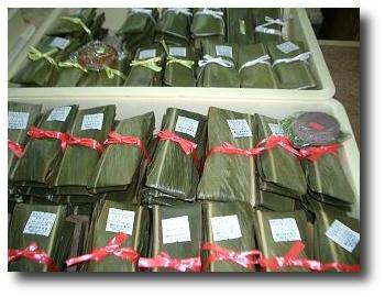 この餅は月桃やクバの葉で包んだ粽です。小さい頃は、年の数だけ鴨居からぶら下げて喜んでいました。ムーチーの頃は沖縄でも寒い日が多く「ムーチービーサ」と呼ばれます。しかし、きょうはぬくぬくとあったかです。年に一度のムーチーの日、きょうはサンニンの香り高いムーチーへLet's try !